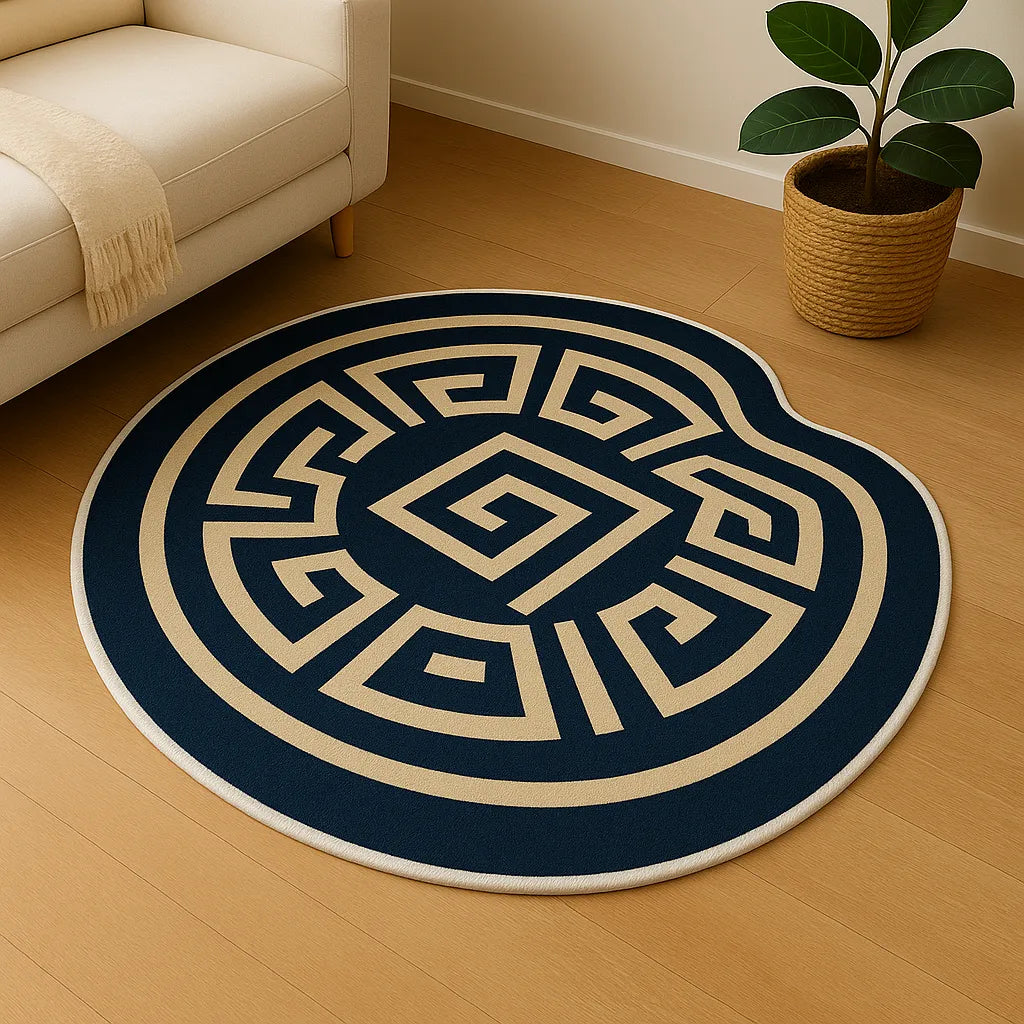 Step into classical elegance with the Meander Spirit Silky Rug, featuring the iconic Greek key pattern—also known as the meander—symbolizing infinity, unity, and flow. The bold navy background and cream-colored labyrinth motif create a timeless contrast, while the softly irregular silhouette adds a modern twist to this ancient symbol.