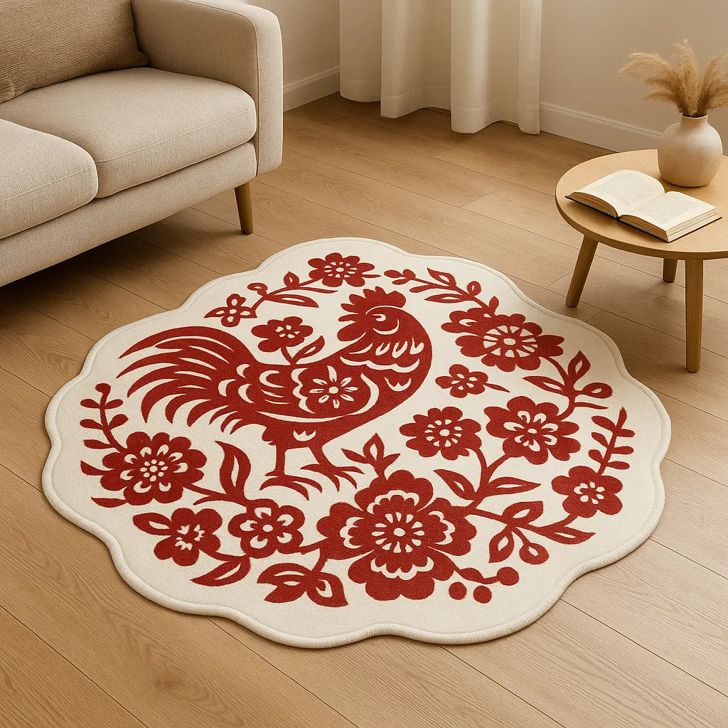 Celebrate tradition with the Papercut Rooster Silky Rug, inspired by the timeless art of Chinese paper-cutting (剪纸). Featuring a proud red rooster surrounded by blooming peonies and plum blossoms, this rug symbolizes good fortune, vitality, and family harmony.