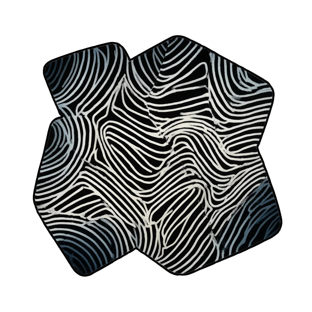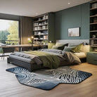 The rhythmic zebra-inspired lines create a sense of movement across the surface, interacting softly with light and shadow. This Irregular Zebra Rug complements modern bedroom furniture, neutral bedding, and clean architectural lines, while its irregular silhouette softens rigid layouts and adds a sense of visual ease.
